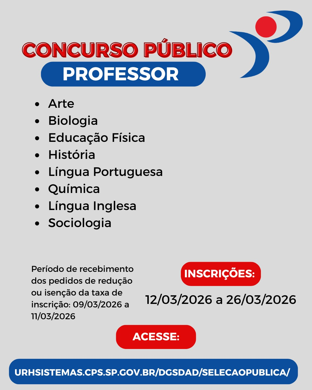 Estão abertas as inscrições para o Concurso Público destinado ao provimento de cargos de Professor nas áreas de Arte, Biologia, Educação Física, História, Língua Portuguesa, Química, Língua Inglesa e Sociologia. O processo seletivo busca profissionais qualificados para atuar na formação e no desenvolvimento educacional dos estudantes.